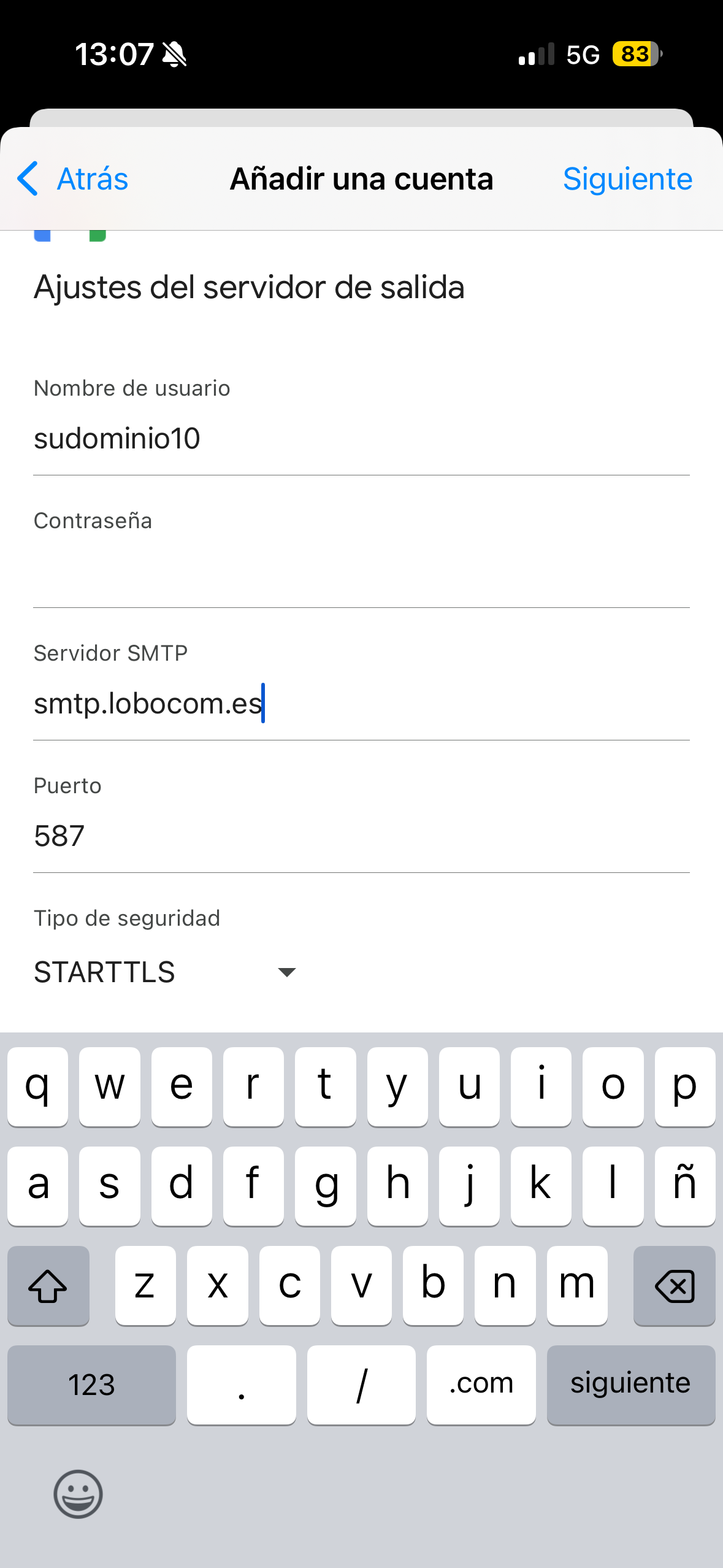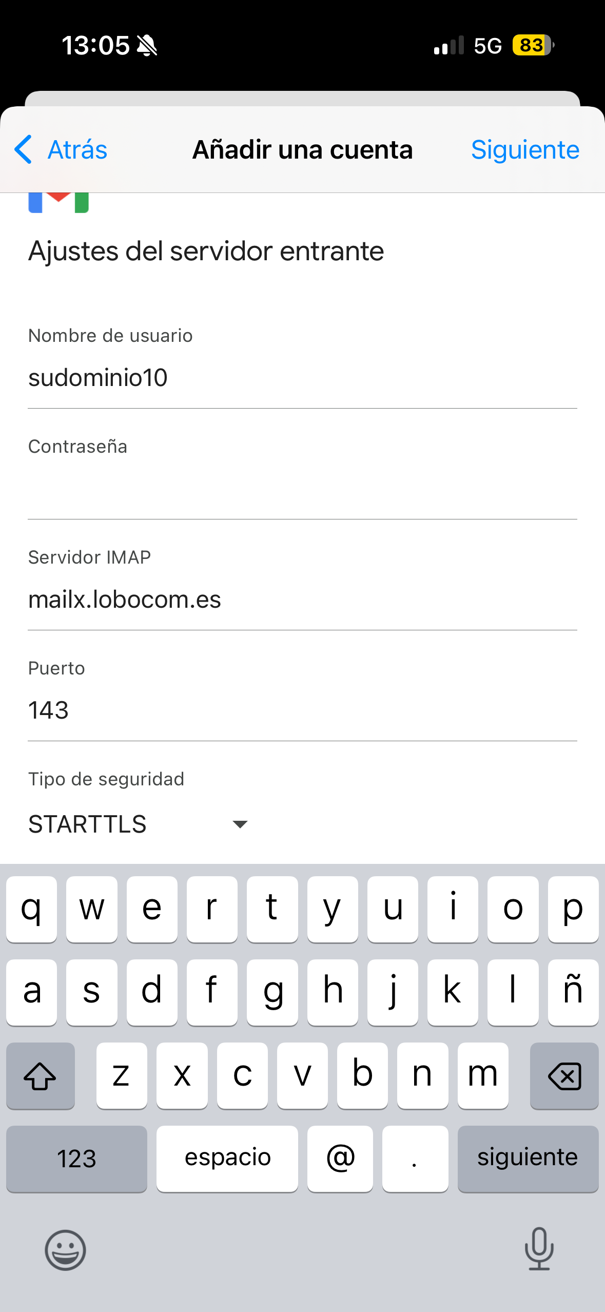 Introduzca sus credenciales y complete los datos del servidor de entrada de la siguiente manera: